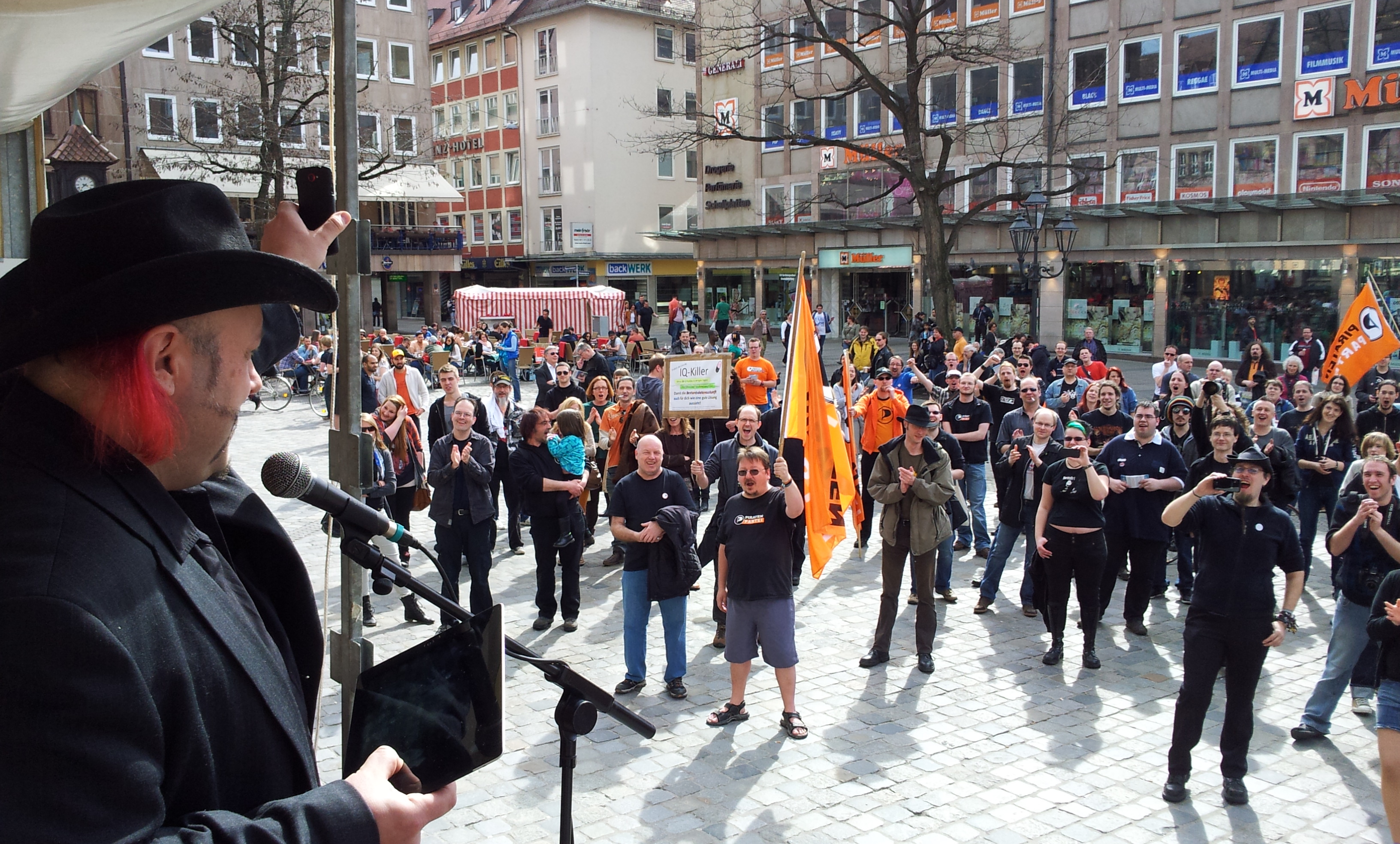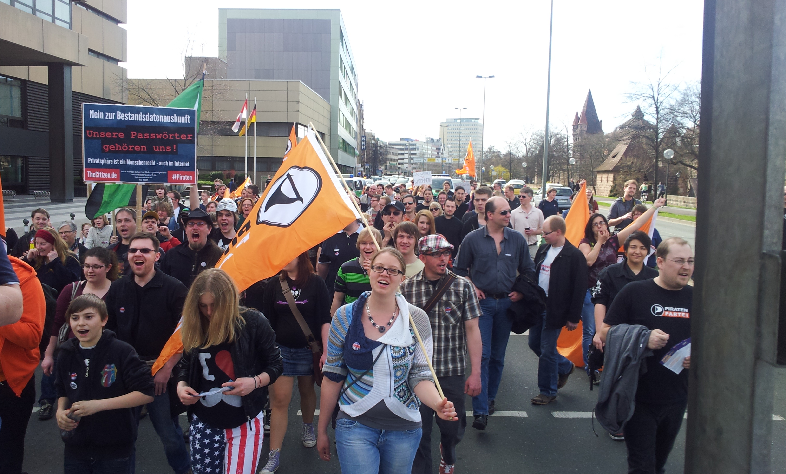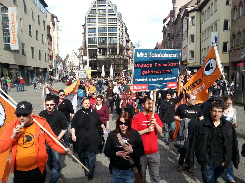 In Nürnberg organisierten wir als Piraten Mittelfranken am Sonntag, 14. April 2013, eine Demo dazu. Bei warmen Temperaturen und strahlendem Sonnenschein nahmen ungefähr 200 Menschen, davon viele Piraten aus ganz Bayern, an Kundgebung und Demozug durch die Nürnberger Innenstadt teil. Als bundesweit Aktiver gegen die Bestandsdatenauskunft und als Landtagslistenkandidat der Piratenpartei Mittelfranken habe ich dort eine Rede gegen die Bestandsdatenauskunft – und für das Menschenrecht auf Privatsphäre im Internet – gehalten. Als Abschlusskundgebung führten wir ein Open Mic durch, bei dem Teilnehmende der Demo der Öffentlichkeit in kurzen, guten Beiträgen mitteilten, warum sie sich ebenfalls über dieses neue Gesetz empören.